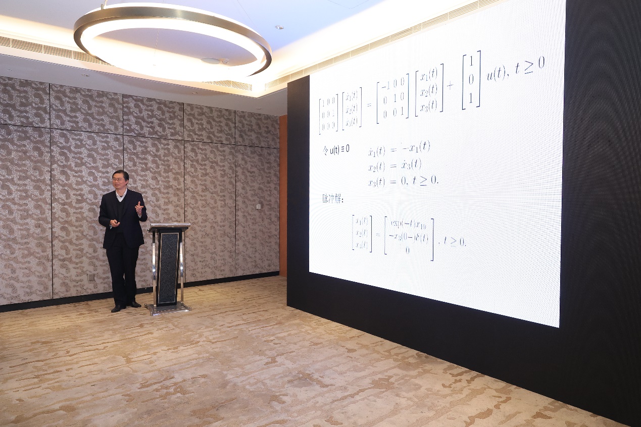 接下来,国家杰青、长江学者、基金委创新群体带头人、南京理工大学徐胜元教授作了题为“广义系统研究进展”的报告。徐教授从状态空间模型的建模开始,介绍了广义系统的特殊之处。随后,以一个三阶系统为例,深入浅出地讲解了广义系统的在鲁棒稳定性、时变、时滞和离散等情况下的不同性质。