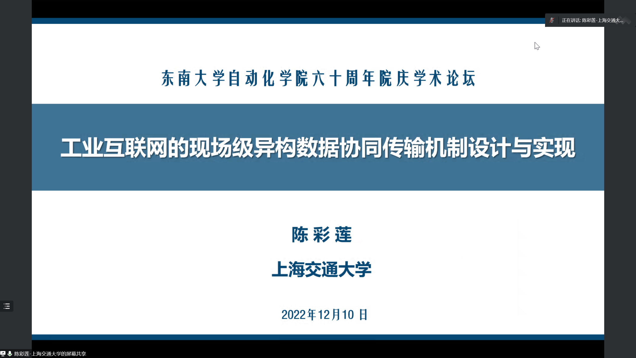 在线上论坛的第二场报告中,国家杰青、上海交通大学陈彩莲教授作了题为“工业物联网现场级异构数据协同传输机制设计与实现”的报告。陈教授总结了工业互联网的研究背景与现状,指明了未来研究道路上的重大挑战与发展趋势,并从匹配制造工艺的互联互通技术、低时延低抖动的TSN技术、高速传输的双线以太网技术等设备平台角度介绍了相关研究成果。