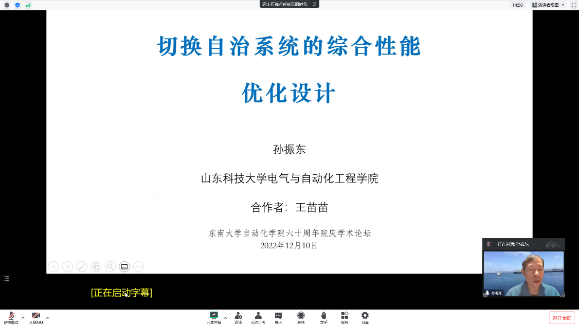 在线上论坛的第四场报告中,国家杰青、山东科技大学孙振东教授作了题为“切换自治系统的综合性能优化设计”的报告。孙教授介绍了切换系统控制的研究背景与现状,指出了Lyapunov函数非凸、表征的不可数性及算法复杂度不可判定性等问题与挑战,并提出了可辨识搜索算法、系统超调和调节时间的上下界估计、基于强化学习的交互式设计算法等关键技术。