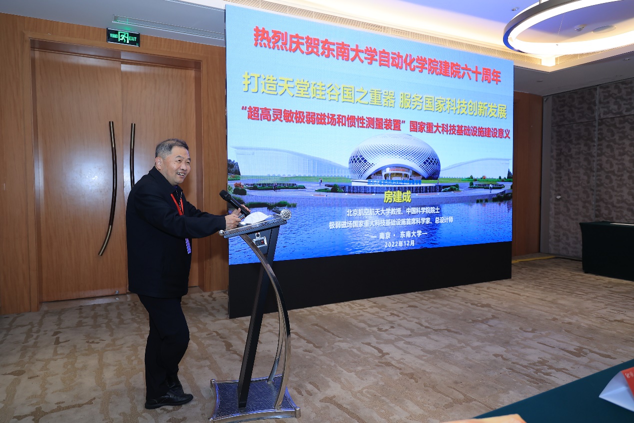 论坛首先由中国科学院院士、北京航空航天大学房建成教授带来题为“打造天堂硅谷国之重器、服务国家科技创新发展——超高灵敏极弱磁场和惯性测量科学装置重大科技基础设施的建设意义”的报告。房院士从认识、改造世界出发阐述了为什么要建设大科学设施,随后讲解了从电通信、光通信到量子通信下极弱磁场技术的新机遇,最后还从医学、芯片、生物学领域分别阐述了极弱磁场测量的应用场景,