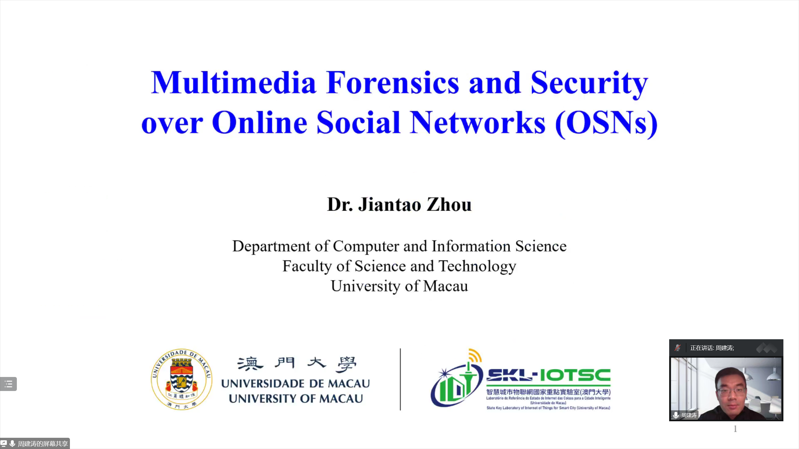 在线上论坛的最后一场报告中,澳门大学周建涛副教授作了题为“面向社交网络的多媒体信息安全和取证”的报告。周教授介绍了社交网络的研究背景与现状,然后对基于OSN的鲁棒图像伪造检测技术、基于OSN的鲁棒摄像机模型识别、OSN上的大容量水印、用于改善OSN共享映像的最优预过滤技术等方面展开了详细介绍。
