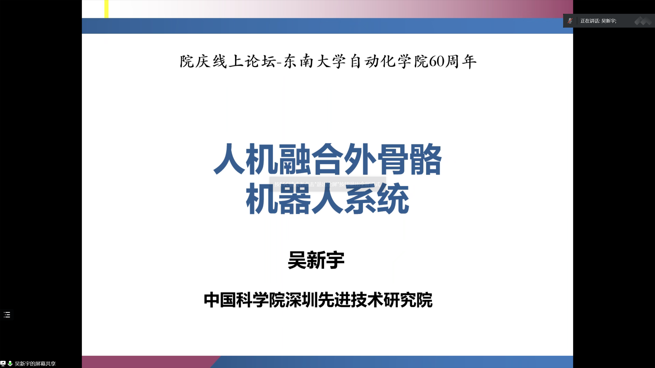 首先,由国家杰青、中国科学院深圳先进技术研究院吴新宇教授带来题为“人机融合外骨骼机器人”的报告。吴教授总结了目前外骨骼机器人的研究意义、应用前景与研究现状,着重指出了未来的挑战性研究方向,并从外骨骼机器人步态规划、多模态信息融合、柔性外骨骼机器人、自平衡外骨骼等方面介绍了团队的先进研究成果。