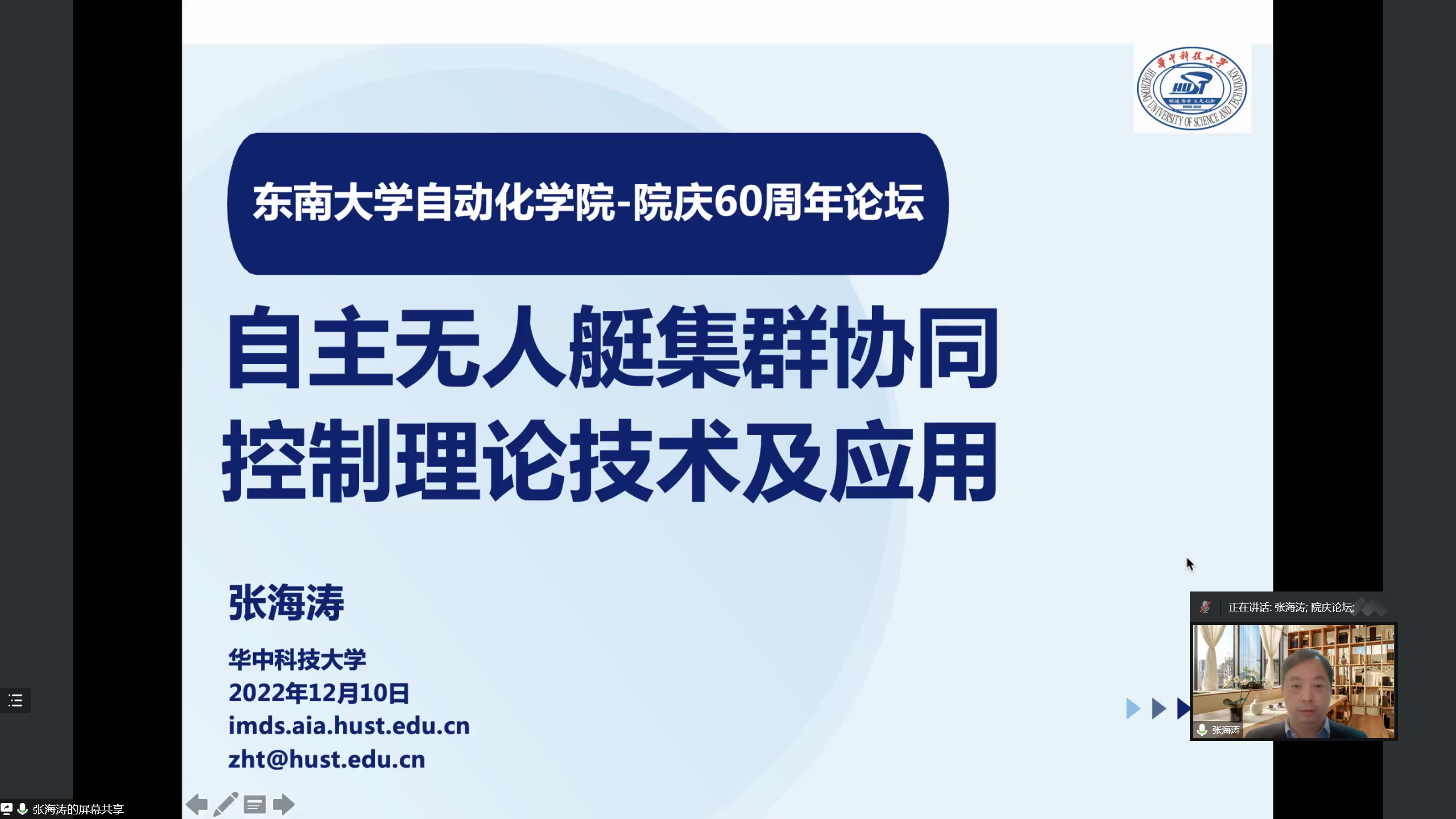接下来,国家杰青、华中科技大学张海涛教授作了题为“自主无人艇集群协同围捕理论、技术及应用”的报告。张教授指出了如何充分利用局部信息加快同步、高效精准调控集群构型应对突发、在多种约束下协同多类无人艇等研究难点与进展,并从创新异构无人艇-机集群立体覆盖理论与技术、无人艇装备、核心部件及系统开发等方面介绍了最新研究成果。