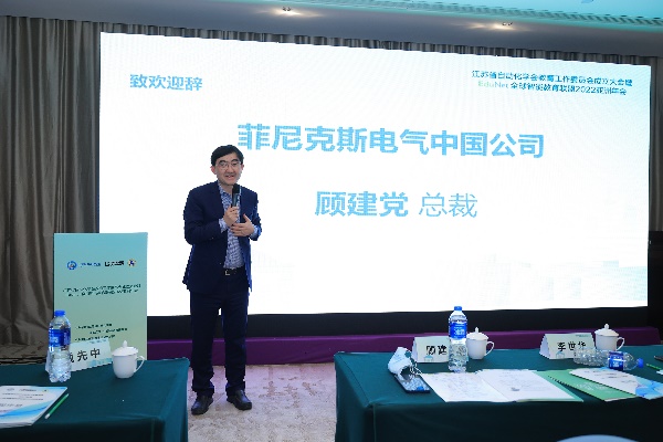 经过短暂休息后,大会开始了下半段议程,由菲尼克斯公共关系与智能教育部经理易书波主持。工委会主任魏海坤教授首先致辞,他强调促进产教融合是工委会的一项重要工作,高校与企业之间要加强人才培养的深度合作,共同推进江苏省教育工作。然后,菲尼克斯电气中国公司总裁顾建党先生发表致辞,感谢与会高校专家对EduNet全球智能教育联盟大力支持,并强调要与高校就人才培养、师资建设、实验室建设等教育工作展开全面合作。随后,菲尼克斯电气EduNet全球智能教育联盟Sponsor Mr.Klaus Hengsbach通过视频向成人论坛 60周年院庆表示祝贺并表示对菲尼克斯电气集团与各高校合作充满期待。
