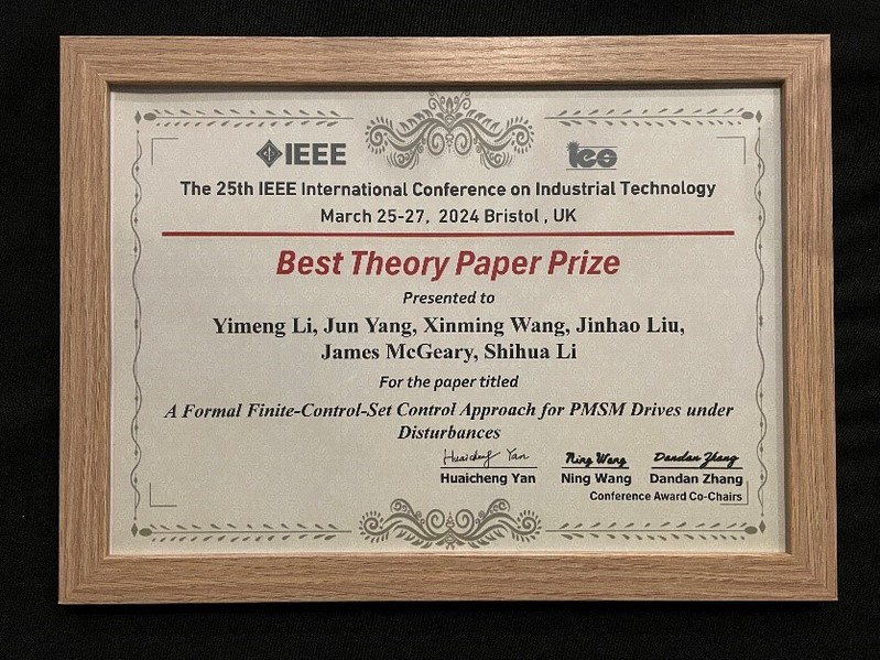 2024年3月25-27日,在英国布里斯托召开的第二十五届IEEE国际工业技术大会(The 25th IEEE International Conference on Industrial Technology, ICIT 2024)上,成人论坛 李世华教授团队的一篇题为“受扰永磁同步电机驱动系统的形式化有限控制集控制方法”(A Formal Finite-Control-Set Control Approach for PMSM Drives under Disturbances)的文章获得了大会最佳理论论文奖(Best Theory Paper Prize)。