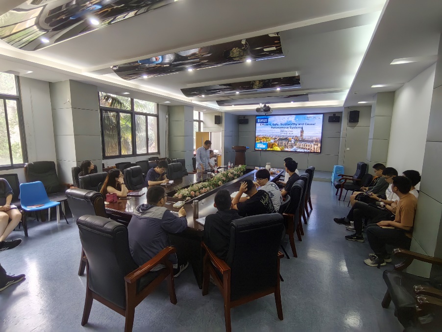 本次报告针对自主系统本身、工作任务以及工作环境所面临的前所未有的机遇和挑战,从无人系统设计中的能耗经济性、安全规划与控制、可信建模与感知、因果推断等四个方面,介绍了无人系统的感知、决策、控制、学习、计算等方面的最新展。报告举例形象生动,引发了师生的热烈讨论。