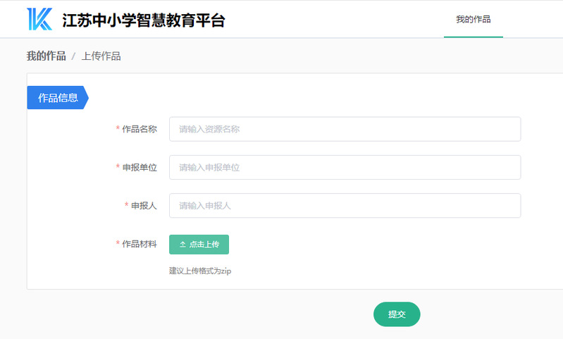 教师身份注册,再重新登录,便可出现下图界面,上传zip包形式的作品材料。
