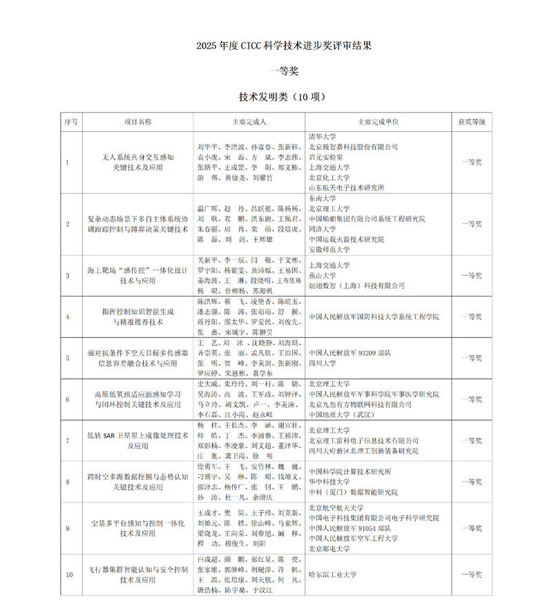 近日,中国指挥与控制学会(CICC)公布了2025年度中国指挥与控制学会科学技术奖评审结果,经资格审查、评审和终评三个阶段,共对64个项目、12名个人进行授奖。成人论坛 作为第一完成单位,联合北京理工大学等五家科研机构共同申报的“复杂动态场景下多自主体系统协调跟踪控制与博弈决策关键技术”项目,荣获技术发明类一等奖(本年度共10项)。